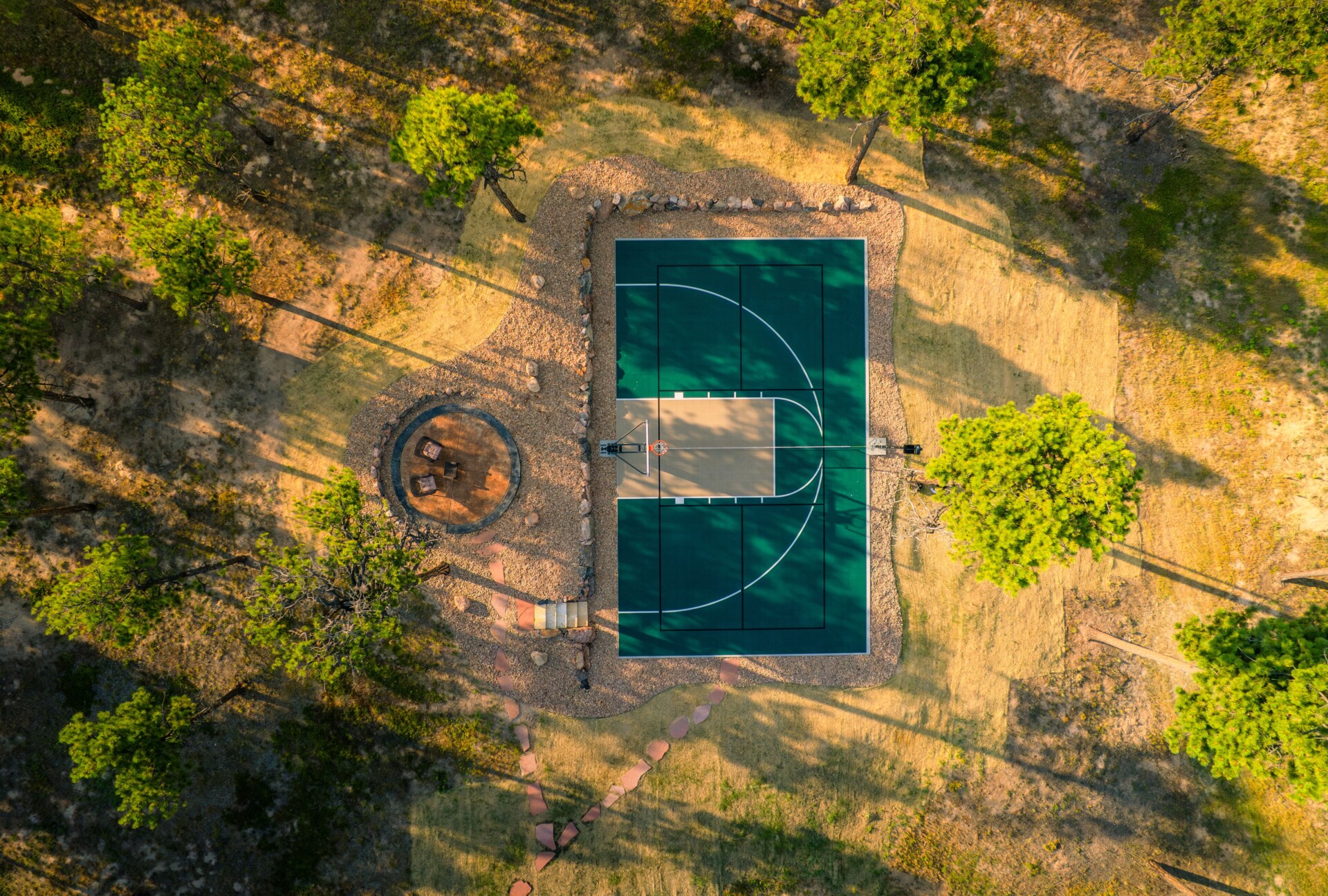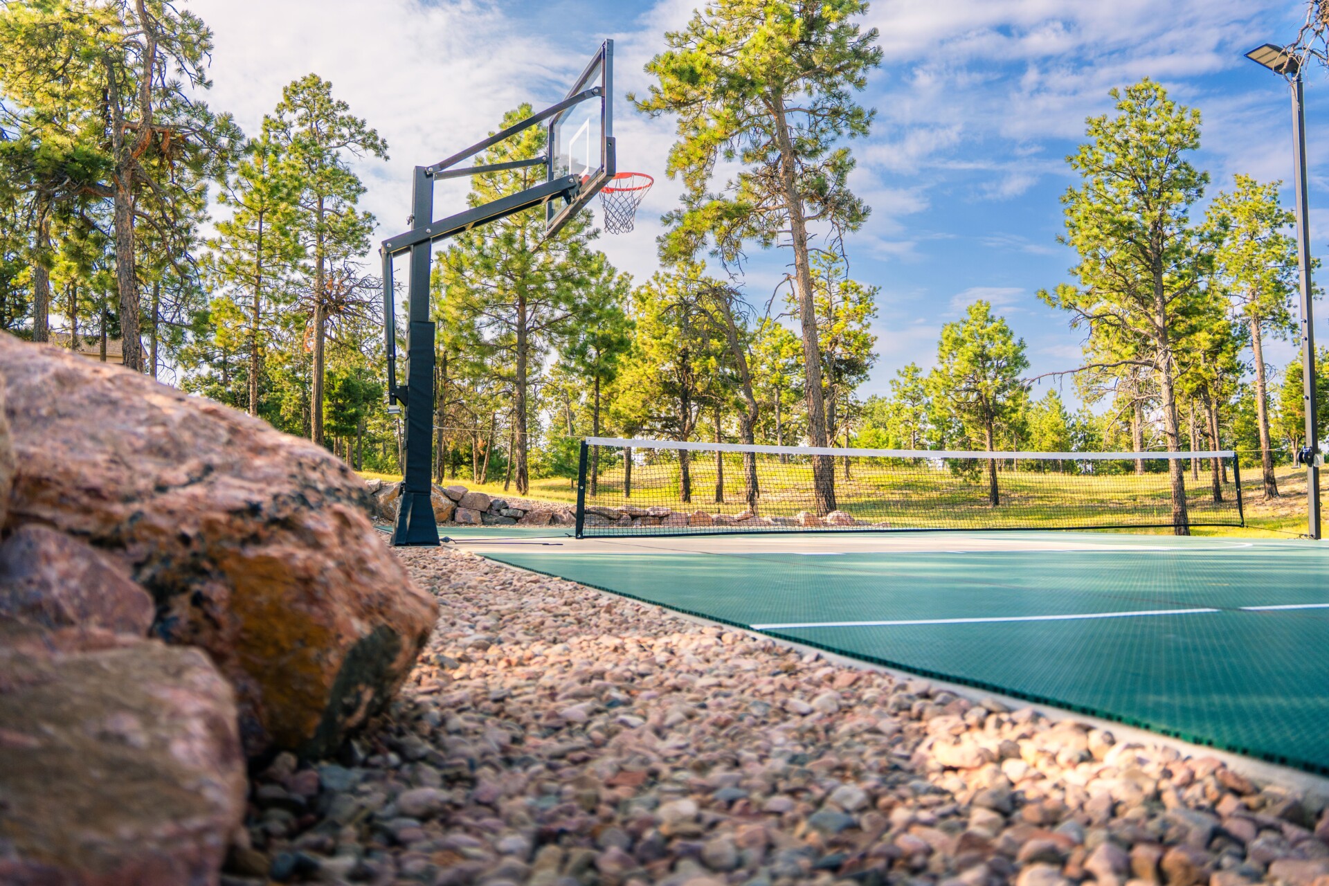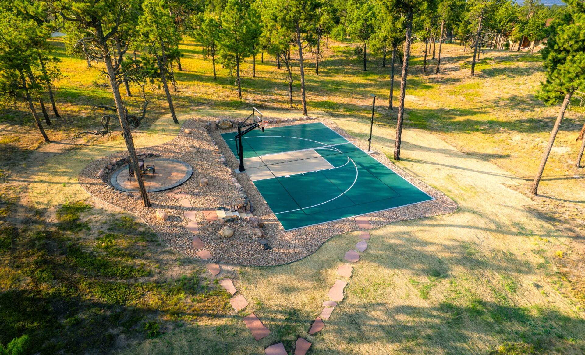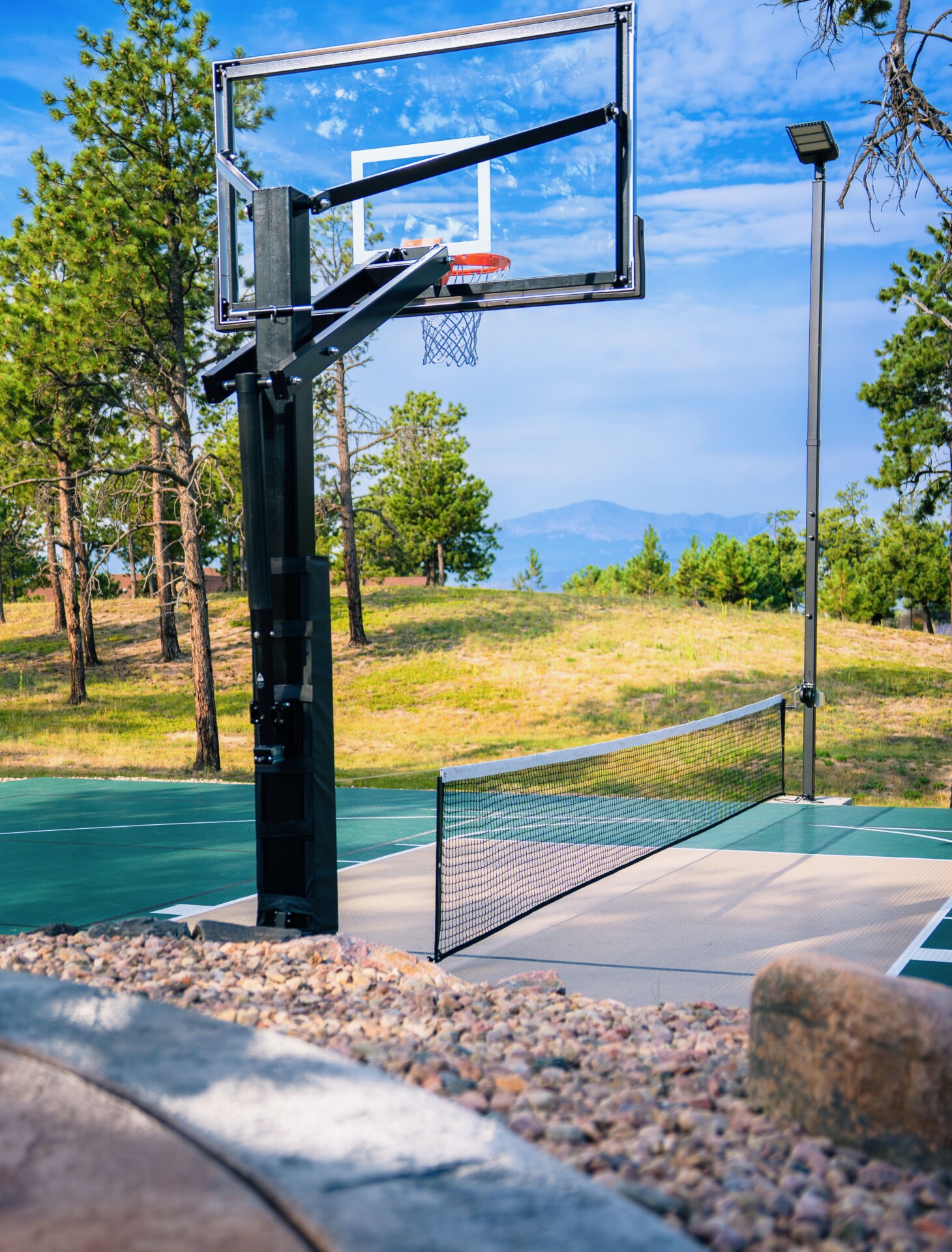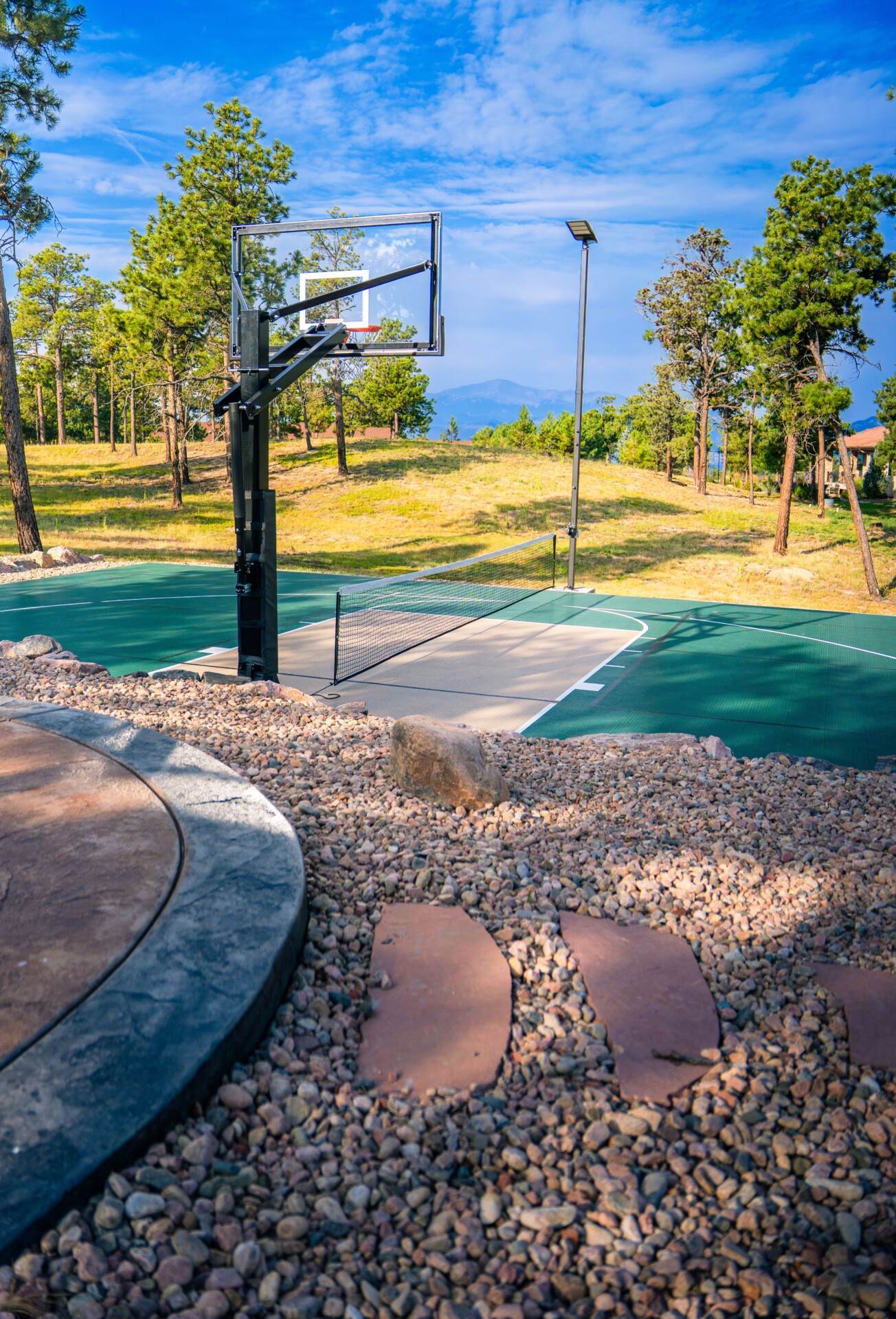 This client wanted a basketball court him and his kids could truly practice on – day or night. Complete with a full legal three point line, pickleball game lines overpayment, and a commercial lighting system; this backyard is sure to get the family outside and having some fun. This yard is nestled beautifully between the trees and set at the perfect elevation to catch views of Pikes Peak from anywhere on the court or the fire-pit view deck above.