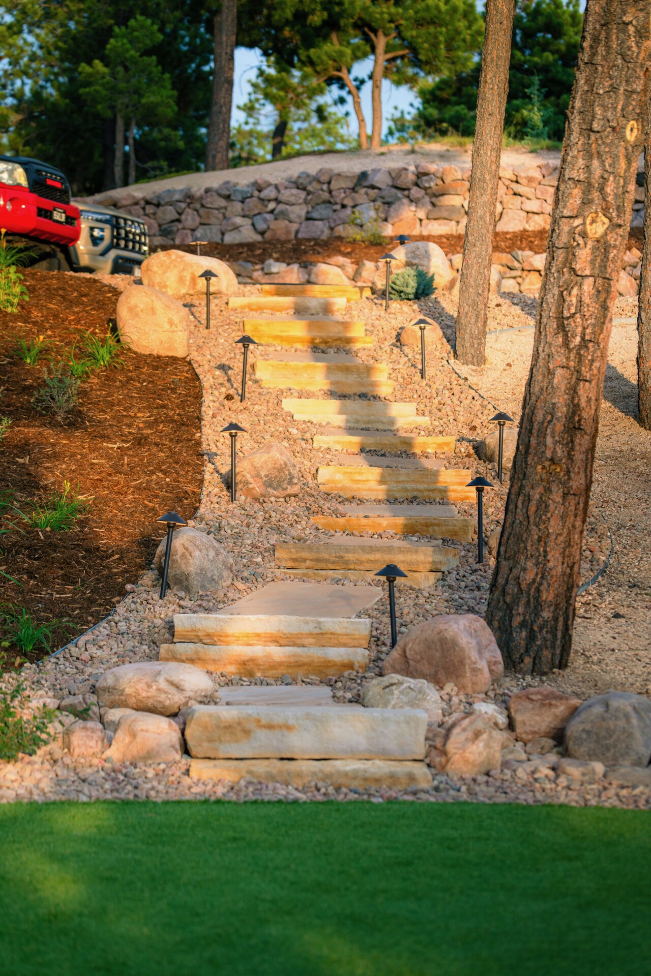 Take a tour of this Parade of Home’s landscape! This one is stunning all the way through. Once we installed one of our beautiful boulder retaining wall a vanishing edge feel can be felt from the walk-out basement all through the backyard. This one truly bridges the gap between what’s natural and prefabricated in the best way.